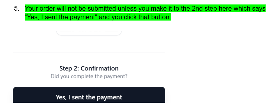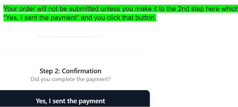 ***Your order will not be submitted unless you make it to the 2nd step here which says “Yes, I sent the payment” and you click that button***